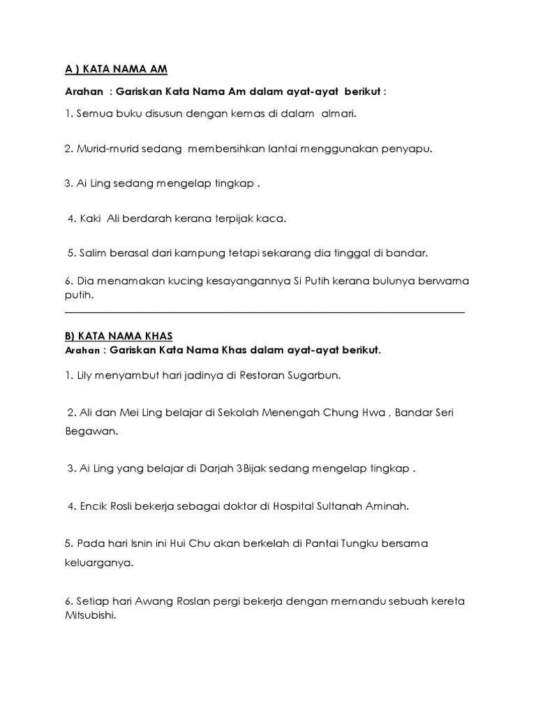* huruf pertama bagi setiap perkataan ditulis dengan huruf besar. Add to my workbooks (1) Digunakan untuk menyebut nama sesuatu benda. Kata nama am digunakan untuk menamakan sesuatu benda orang binatang dan tempat secara umum. Latihan kata nama am dan khas tahun 5 nota sains . Myguru merupakan portal pembelajaran yang dibina selaras dengan keperluan silibus pelajar tahun 1 hingga tingkatan 5. Interactive worksheet latihan buku aktiviti bm tahun 3 ms 6. 10 suami isteri isteri suami suami isteri isteri suami suami 9 7 5 3 isteri 1 2 4 6 8 10 meja khas suami isteri duduk berjauhan dan berselang . ( ) seekor binatang yang pintar lagi bijak. Latihan kata nama am dan kata nama khas tahun 2 kuiz rancangan mainan. Interactive worksheet kata nama am dan kata nama khas. Ayah menghadiahi abang sebuah motosikal .